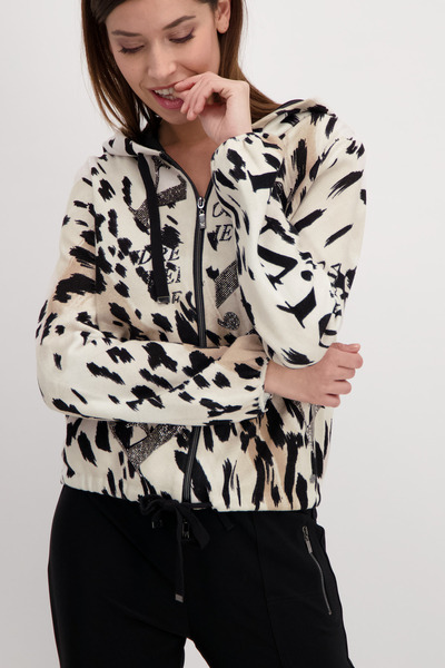 Die Baumwoll-Jacke von monari erhält durch den verspielten Schrift-Jacquard mit funkelndem Strassbesatz am rechten Ärmel und auf der Vorderseite ein erfrischendes Update. Die gerade Form mit Kapuze, langen Ärmeln und einem Zwei-Wege-Reißverschluss sowie ein Allover-Leo-Jacquard setzen dabei ein perfektes Finish. Erweitern Sie Ihre Garderobe um diesen raffinierten Begleiter. Zur dunklen Hose im Jogging-Stil ein echter Blickfang.