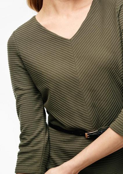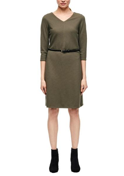 Strukturmuster im Streifen-Design, V-Neck mit nahtfeinem Reißverschluss hinten, verkürzte Ärmel in 3/4-Länge, schmaler Gürtel in Leder-Optik in der Taille, Slim Fit mit leicht ausgestelltem Rockteil; Rückenlänge bei Größe 36 ca. 92 cm, softe, elastische Web-Qualität aus Viskosemix