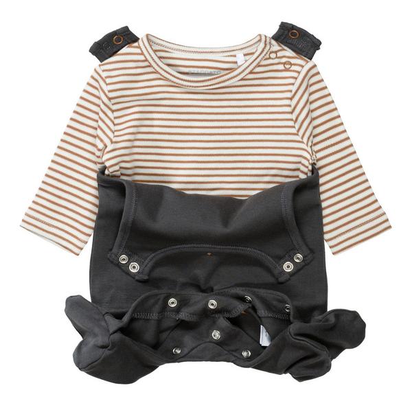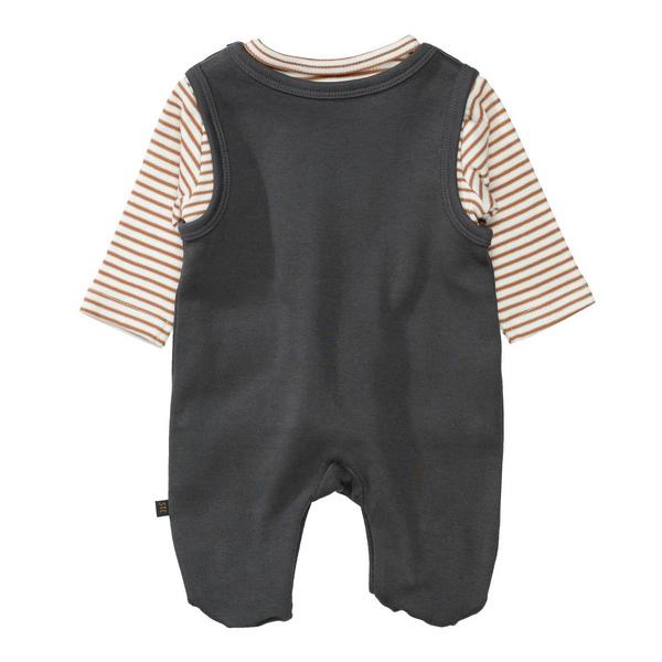 Mit diesem zuckersüßen Strampler-Set bestehend aus einem unifarbenen Strampler und einem gestreiften Langarmshirt, ist Ihr Baby-Boy im Handumdrehen perfekt angezogen! Auch die reine Bio-Baumwollqualität überzeugt zusammen mit dem niedlichen Wording-Print auf voller Linie.