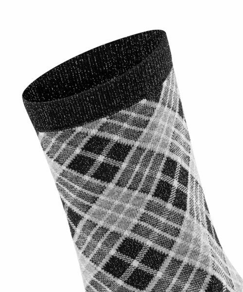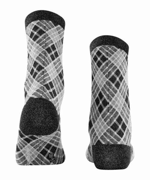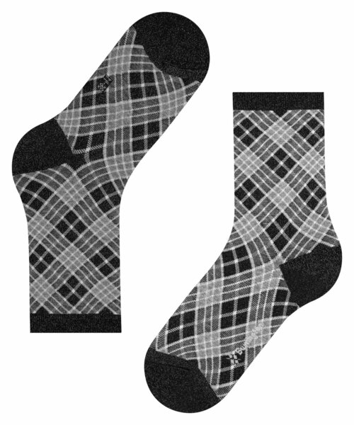 Das Karomuster mit Rauten-Akzentuierung wird bei dieser Socke von Spitze, Ferse und Bündchen in Unifarbe dekorativ unterbrochen. Neben dem typischen Burlington-Clip und dem Burlington-Sohlendruck feiert dieses schicke Damenbasic mit schimmerndem Lurex sein modisches Comeback.