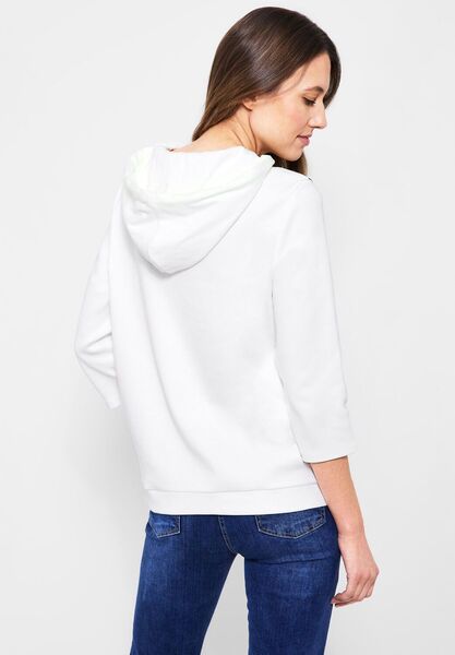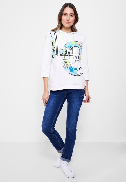 Love yourself! Damenshirt von CECIL, das sich im sportlichen Hoodiestyle präsentiert. Die Kapuze wird durch die beiden Tunnelzugbänder zum tollen Blickfang. Ärmel in 3/4-Länge und ein farbenfroher Frontprint runden den lässigen Style ab.