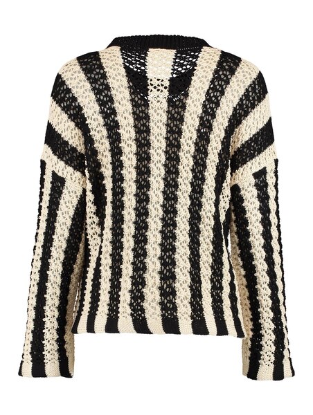 Gestreifter Häkelpullover mit hohem Rundhalsausschnitt und langen Ärmeln.