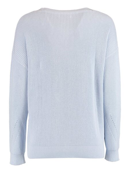 Locker sitzender Strickpullover mit V-Ausschnitt und Strickdetails im Vorderteil und an den Ärmeln.
