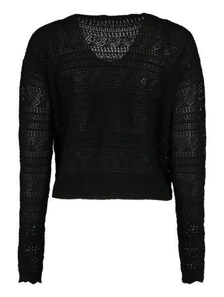 Kurze Strickjacke mit transparentem Strickmuster und bezogenen Knöpfen.