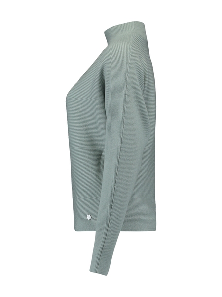 Langarmpullover mit einer strukurieren querstreifgen Optik. Der Feldermausärmel schafft einen lockeren Schnitt. Der Ausschnitt ist durch einen breiten Stehkragen gestaltet.