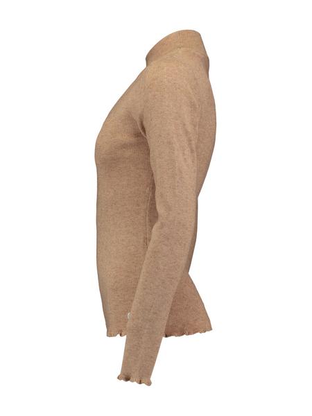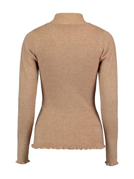 Schmal geschnittener Pullover mit breitem Stehkragen. Rüschen an den Ärmeln und am Saum.