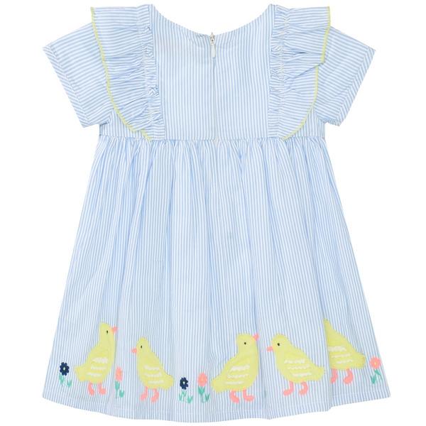 Ein Allrounder für sommerliche Tage. Dieses hübsche Kleidchen im Streifen Design punktet mit süßen Applikationen und Volants. 100% Baumwolle Streifen-Design kleine Enten und Blümchen-Applikation am Saum Volant auf Brusthöhe Innenfutter mit Volant aus reiner Baumwolle