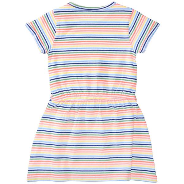 Dieses wunderschöne Streifen-Kleid für Mini-Girls sorgt direkt für Sommerlaune! Rundhalsausschnitt kurze Ärmel mit Umschlag Gummizug in der Tailie mit Kordeln mehrfarbiger Streifen-Print Vogel-Applikation im Brustbereich