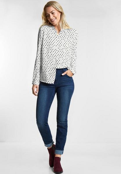 Die lockere Bluse bringt Abwechslung in ihre Looks. Der Print-Mix punktet mit Sternen, Herzchen und Punkten. Für klassische Elemente sorgen der Kragen und die durchgehende Knopfleiste. Auch der Rücken wird mit der leichten Raffung perfekt in Szene gesetzt. Die langen Ärmel werden mit einem kleinen Knopf geschlossen und der lockere Schnitt bietet Bewegungsfreiheit. Auch das super softe Viskose Material bringt Bequemlichkeit und macht die Bluse endgültig zum neuen Lieblingsteil für alle möglichen Gelegenheiten.\n\n Print-Mix Bluse mit gerafftem Detail\n Mit Pünktchen, Sternen und Herzchen\n Kragen und Knopfleiste\n Maße bei EU-Größe XS ca.:\n Länge 72cm, Breite 49cm, Taille 49cm\n Material: 100% Viskose\n\n