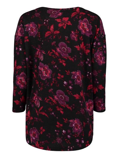 Pullover mit einem überschnittenem 3/4 Arm und weichem Griff. Rundhalsausschnitt und abgerundeter Saum. Blumen Print auf schwarzem Grund.