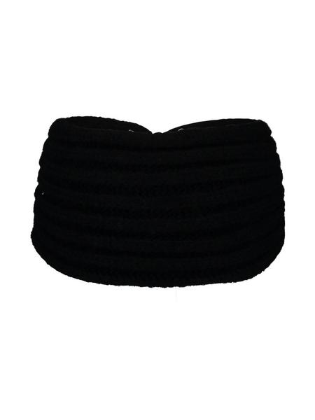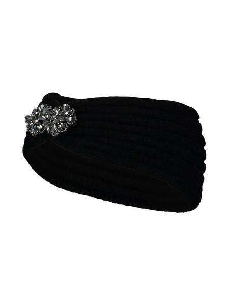 Das grob gestrickte Stirnband hat ein farblich abgestimmtes Glitzersteinelement auf der Vorderseite.