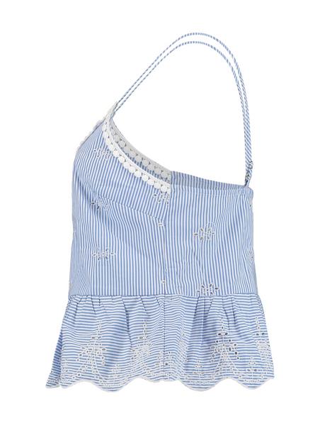 Top mit Spitzenstickerei, verspielte Optik duch Trennnaht unterhalb der Brust, Zier-Knopfleiste, Pompom-Bodüre am Ausschnitt