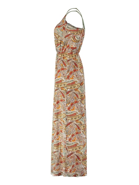 Langes Trägerkleid mit Taillenbund, verstellbaren Trägern, Rundhalsausschnitt und Palmenmuster