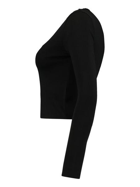 Langarmshirt mit einer figurbetonten Passform und einer leichten Raffung unterhalb des V-Ausschnitts. Kleine Spitzendetails am Ausschnitt.