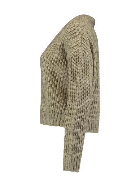 Grober Strickpullover mit Rollkragen. Rollkragen und Bündchen sind in Rippstrick abgesetzt.