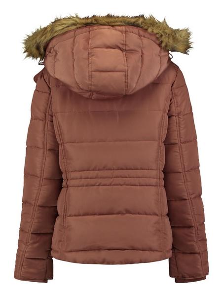 Steppjacke mit farblich abgesetzen Kunstfell gefüttert, sowie im Kragen und an der Kapuze. Seitliche Reißverschlusstaschen und Taillierung.