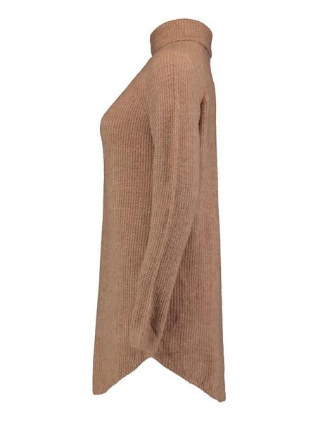 Langer Strickpullover mit Rollkragen. Abgerundete Kante, lange Ärmel.