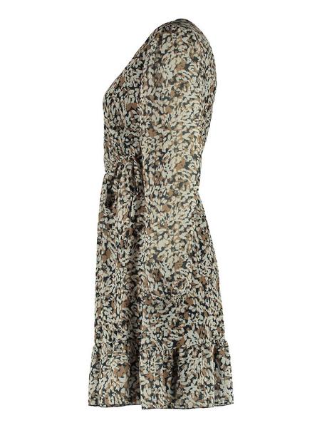 Kleid mit All-Over-Print und V-Ausschnitt, lange Arme, Taillierung.