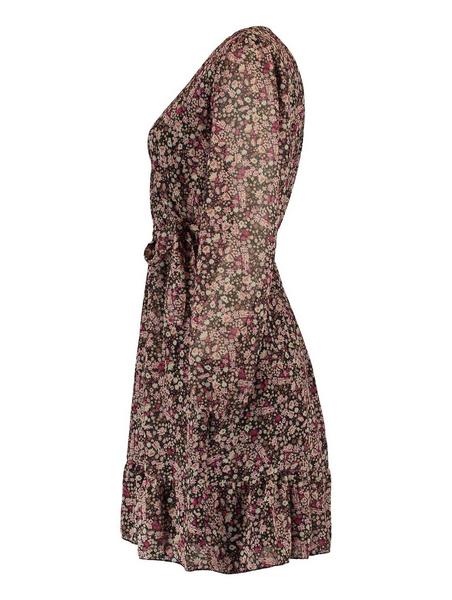 Kleid mit All-Over-Print und V-Ausschnitt, lange Arme, Taillierung.