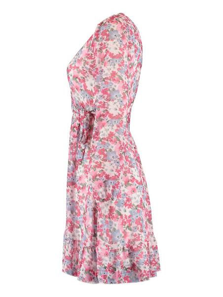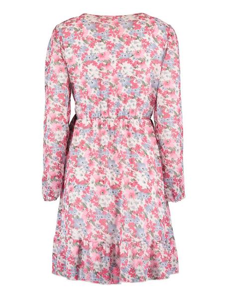 Kleid mit All-Over-Print und V-Ausschnitt, lange Arme, Taillierung.