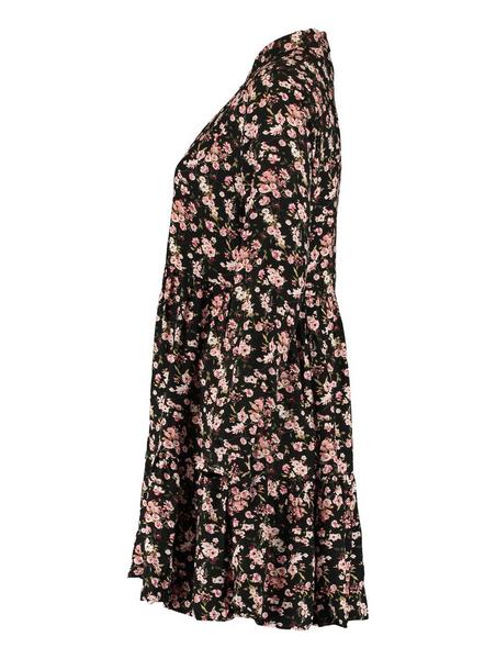 Kleid mit langen Ärmeln und einem Blusenkragen. Es wird ab der Taille weiter und hat eine Knopfleiste auf der Brust. Es hat einen All-Over-Print mit einem Blumenmuster.