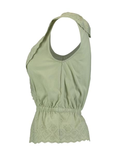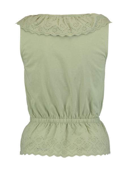Ärmelloses Top in Wickeloptik mit V-Ausschnitt. Lochstickerei und Folants am Ausschnitt. Mit Schößchen und Gummibund in der Taille.