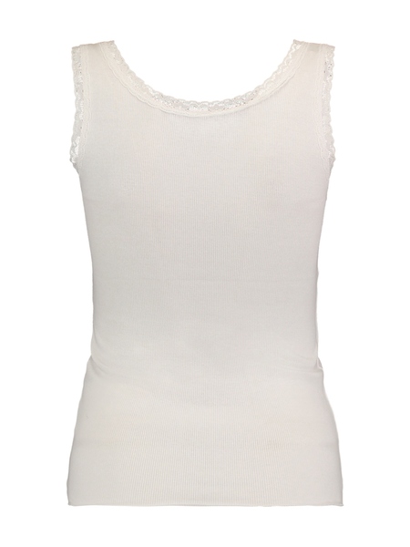 Das Top hat einen Rundhalsausschnitt und breite Träger mit Spitze an den Kanten. Die Passform ist figurbetont und es hat eine Rippoptik.