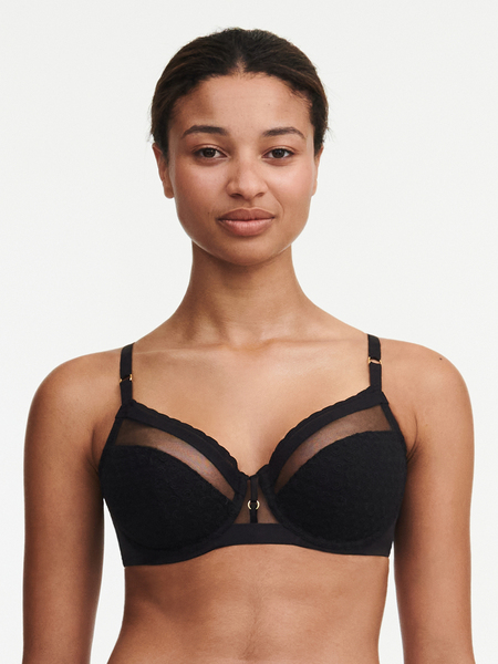 * Sitting on a base *3 parts constructed cups *Bottom cups in embroidery, lined with laminated knit for a more lifted, recentered and supported breast *Upper cups in rigid tulle *Neckline decorated with a refined elastic *Centerfront in rigid tulle, decorated with a golden buckle *Sides lined with rigid tulle *Chimney back in elastic tulle and embroidery, delimited by a refined hemstitched finish and lined with elastic tulle in all sizes *Fixed straps, decorated with a golden jewel and then adjustable *4rank hook&eye *Golden Chantelle plate at the sides