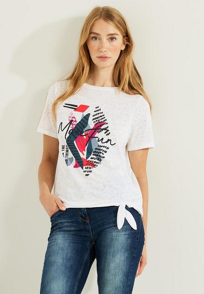 Stay Fashionable! Das Damen T- Shirt von CECIL mit Halbarm und U-Boot Ausschnitt setzt auf einen modernen Look. Die Front ist mit einem mehrfarbigen Print in Burn Out Dessin verziert und überrascht mit einem Schleifendetail am Saum. Ein perfektes Sommershirt für vielseitige Looks.