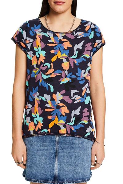 * Reine Baumwolle * Gerade Passform * Allover-Print * Runder Ausschnitt * kurze Ärmel * Gerollte Kanten an Ausschnitt, Ärmeln und Saum * Vorne kürzerer Saum