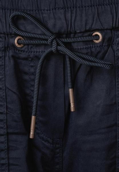 Sporty but nice: die lässige Hose trägt sich besonders bequem und hat mit den angedeuteten Backpockets coole Details! Der Loose Fit ist ideal für den entspannten Look. Der Elastikbund mit Tunnelzugbändchen sorgt für einen guten Sitz. Die verkürzten Beine in angesagter 7/8 Länge sind ideal für das sommerliche Outfit.\n\n\n Loose Fit Hose Chelsea\n Mid Rise\n Locker geschnittenes Bein in 7/8 Länge\n Seitliche Einschubtaschen und Fake Backpockets\n Elastikbund mit Tunnelzugbändchen\n Maße bei EU-Größe 26/28 ca.:\n Innenbeinlänge 71cm, Saumweite 16cm\n Material: 98% Baumwolle, 2% Elasthan