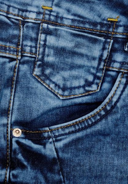 Living your best denim life: Die Loose Fit Denim im Style Scarlett begeistert mit verkürzten Slim Legs und mittelblauer Waschung. Der klassische 5-Pocket Style und der Verschluss mit Reißverschluss und Doppelknopf rundet den Look ab. Der Baumwoll-Elasthan Mix garantiert einen perfekten und bequemen Sitz.\n\n\n Loose Fit Denim\n Mittelblaue Waschung\n Reißverschluss und Doppelknopf\n 5-Pocket Style\n Verkürzte Slim Legs und Middle Waist\n Maße bei Inch-Größe 26/22 ca.:\n Innenbeinlänge 56 cm, Fußweite 18 cm\n Material: 97% Baumwolle, 3% Elasthan