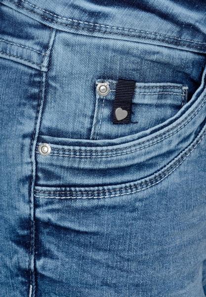 Blaues Wunder: Die Loose Fit Denim Scarlett von CECIL wird mit Crinkles und Effekten im Used Look auf der hellblauen Waschung hervorgehoben. Die Knopfleiste als Verschluss ist neu gestaltet und der 5-Pocket Style rundet den Look klassisch ab. Mit Middle Waist und Slim Legs entsteht ein lässiger Alltagslook mit coolen Details!\n\n\n \n \n Loose Fit Denim\n \n\n \n Middle Waist und Slim Legs\n \n\n \n Neu dekorierte Knopfleiste\n \n\n \n 5-Pocket Style\n \n\n \n Hellblaue Waschung mit Crinkles und Used-Look\n \n\n \n Maße bei Inch-Größe 26/32 ca.:\n Innenbeinlänge 81 cm, Fußweite 15 cm\n \n \n Material: 67% Baumwolle, 31% Polyester, 2% Elasthan