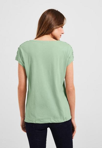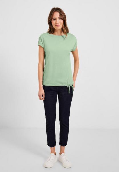 Feel free! Feminines Damen T-Shirt von CECIL mit U-Boot Ausschnitt. Das Tunnelzugband im Saum und der Kurzarm sorgen für einen bequemen Fit. Hingucker sind die Raffungen auf den Schultern, die dem unifarbenen Shirt seinen ganz individuellen Look geben.