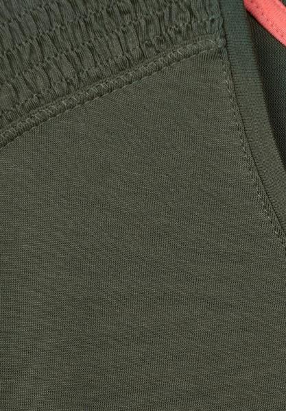 Schultern zum Entzücken! Das T-Shirt von CECIL wird an den Schultern durch gesmokte Details verfeinert und bekommt so seinen einzigartigen Look. Die locker geschnittenen Ärmel sitzen lässig und das Tunnelzugband am Saum lässt sich durch ein cooles Knotendetail verzieren. Mit dem soften Materialmix ist ein hoher Tragekomfort garantiert!\n\n\n T-Shirt mit Smok-Detail\n Rundhalsausschnitt\n Überschnittene Schultern\n Tunnelzugband am Saum\n Supersoftes Tragegefühl\n Maße bei EU-Größe M ca.:\n Länge 64 cm, Brust 55 cm, Saumweite 56 cm\n Material: 50% Baumwolle, 50% Modal