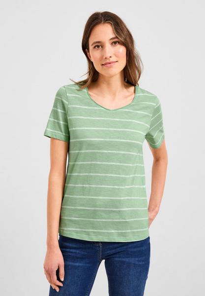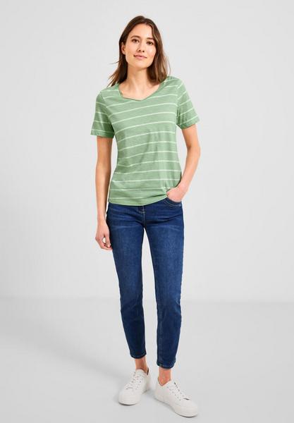 In Basics we trust! Damen T-Shirt von CECIL, das im sportlichen Streifenmuster begeistert. Die softe Baumwollqualität erhält durch die Flammgarnoptik einen modernen Look. Ein abgerundeter V-Ausschnitt unterstreicht den sportlich-lässigen Look des Basicstyles perfekt.