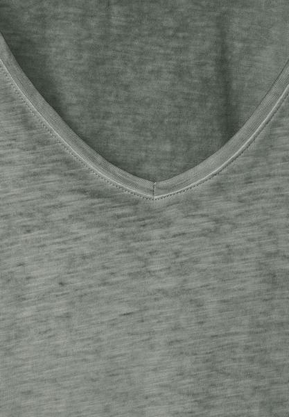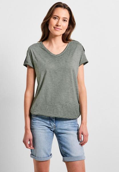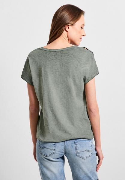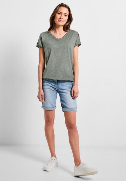 Sun, Summer, Smile! Cool und lässig wirkt dieses Damen T-Shirt von CECIL. Die Unifarbe überrascht in gewaschener Optik auf Flammgarn. Elastiksaum und V-Ausschnitt sorgen für einen angenehmen Fit. Hingucker sind die sommerlichen Schultern mit Knopfdetail, die besonders luftig sind. Ein dezentes, seitliches Wording zaubert einen Extra-Hingucker T-ShirtV -AusschnittSchulterdetailsElastiksaumGewaschene Optik Maße bei EU-Größe M ca.: