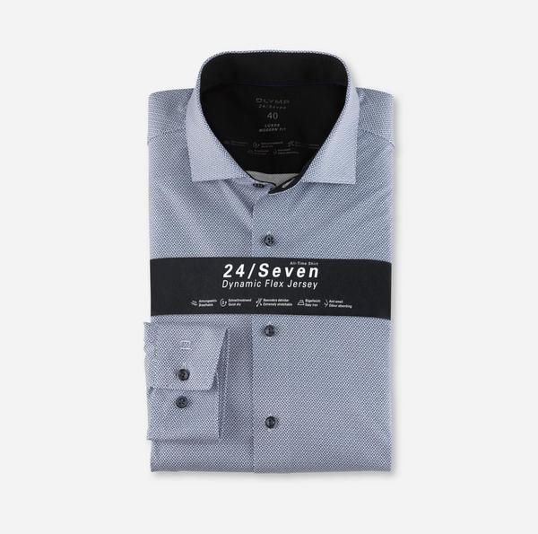 Maximale Bewegungsfreiheit, Formstabilität, Casual-Lässigkeit und Business-Seriosität – das 24/Seven-Jersey-Hemd erweitert die Serie OLYMP Luxor modern fit um eine besonders stylishe Variante. Spezielle Baumwollgarne erhalten in der innovativen Mischung mit Elasthanfasern eine unvergleichbar lässige, fein strukturierte und dynamische Textur. Sie unterstreichen den leicht taillierten Schnitt knitterfrei und begeistern durch ihren hautsympathischen Tragekomfort sowie einmalige Pflegeeigenschaften. Das attraktive Minimal-Dessin und harmonischer Farbstellung sowie ein smarter New Kent sorgen ganz relaxed für die professionelle Performance, egal ob virtuell aus dem Homeoffice oder real life unter KollegInnen. Mit attraktivem Kontrastbesatz, ohne Brusttasche.