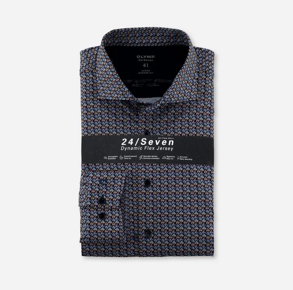 Dance like everyone is watching. Das 24/Seven-Dynamic-Flex-Shirt begeistert mit maximaler Bewegungsfreiheit und Formstabilität. Dieses OLYMP Luxor modern fit ist bequem wie ein T-Shirt und mit dem klassischen Kent-Kragen stilvoll wie ein Hemd. Das gestochen scharfe Grafik-Dessin wurde im unvergleichlichen Digitalprint-Verfahren aufgebracht und begeistert durch die raffiniert umgesetzten Farbverläufe. Die atmungsaktiven, schnelltrocknenden, bügelleichten und geruchshemmenden Materialeigenschaften der stretchigen Jersey-Textur machen dieses innovative Businesshemd zu einem individuellen Eyecatcher. Geschnitten in leicht taillierter Modern-Fit-Linie präsentiert sich dieses Businesshemd als perfekte Symbiose von Style und Komfort. Übrigens, der Standard 100 by OEKO-TEX® und das Green-Choice-Label dokumentieren einen durchgehend nachhaltigen, ökologischen und sozialverträglichen Produktionsprozess. Das ist OLYMPs Haltung, Style und Statement.