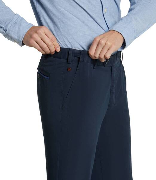 MEYER Hosen präsentiert hier die perfekte Reisehose. Der spezielle Dehnbund, der bis zu 8 cm Extraweite gibt, macht auch längeres Reisen in Auto, Zug oder Flugzeug entspannt und angenehm. Der leichte Feingabardine besticht durch seine besondere Haptik und das leichte Tragegefühl. Die organische Baumwolle wurde ganz MEYER typisch unter sozialverantwortlichen, fairen und natürlich absolut transparenten Bedingungen verarbeitet. Optisch fallen die harmonisch abgesetzten Paspeln an den seitlichen Eingrifftaschen und den geknöpften Gesäßtaschen ins Auge und unterstreichen den entspannten Charakter.