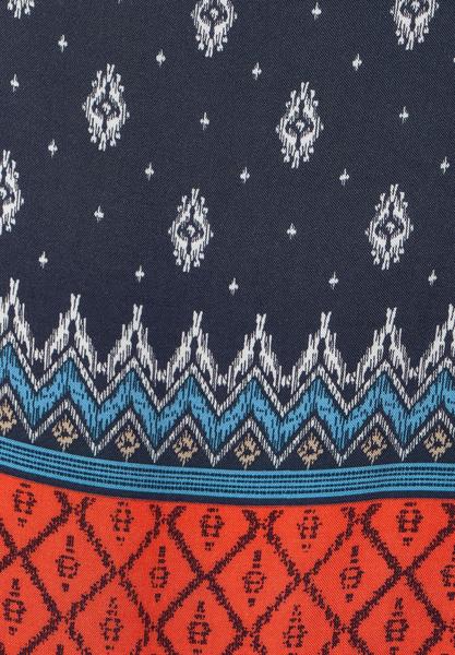 Von den Inkas inspiriert: Die Bluse von CECIL wird durch einen Mustermix im Ethno-Style verziert und so zum Eyecatcher. Die 3/4 Ärmel fallen locker und werden durch ein Knotendetail sportlich dekoriert. Das softe Material sorgt für ein Wohlgefühl auf der Haut.\n\n\n Bluse mit Mustermix im Ethno-Style\n Rundhalsausschnitt\n Knotendetail an den 3/4 Ärmeln\n Softer Materialmix\n Unifarbene Rückseite\n Maße bei EU-Größe M ca.:\n Länge 67 cm, Brust 55 cm, Saumweite 58 cm\n Material: Vorderseite: 100% Viskose, Rückseite: 50% Viskose, 50% Modal