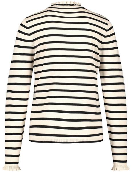 Rüschenkanten an Kragen und Ärmel. Unser Ringelpullover ist ein absolutes Must-Have für deinen Kleiderschrank! Dieser Pullover ist nicht nur vielseitig kombinierbar, sondern auch super süß. Die Rüschenkanten verleihen ihm eine verspielte Note, während der Feinstrick für ein leichtes und angenehmes Tragegefühl sorgt. Egal, ob du ihn zu Jeans oder Röcken trägst, mit diesem Pullover bist du immer stylish unterwegs.