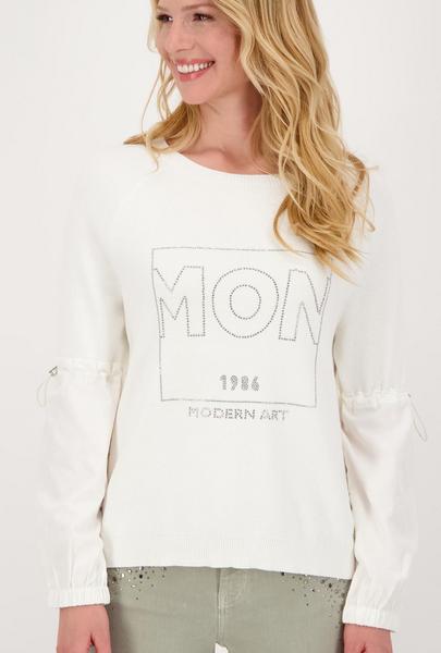 Zeigen Sie Ihren neuen Lieblings-Pulli von monari. Das Regular Fit Modell kommt mit Rippenbündchen am Saum und am Rundhals sowie mit funkelnder Strassschrift mit Strassumrandung auf der Vorderseite. Die langen Raglanärmel werden von einem angesetzten Webteil mit Gummiband an der Ansatznaht ergänzt, während die Ärmelenden mit einem elastischen Gummiband vollendet werden. Durch das angesetzte Webteil präsentiert sich das Modell im angenehmen Materialmix mit hochwertiger Baumwolle. Für den perfekten Tragekomfort und einen angesagten Look genau der richtige Strickpullover. Zur coolen Slim Fit Jeans mit Schmuck und derben Boots ein echter Hingucker!