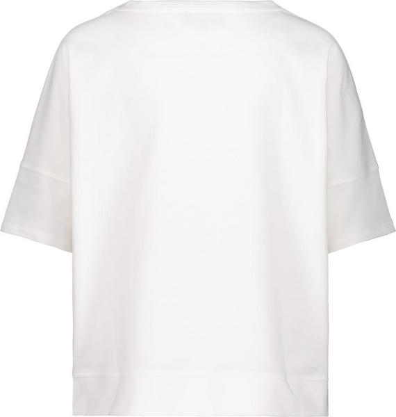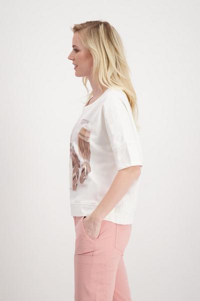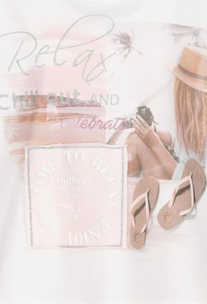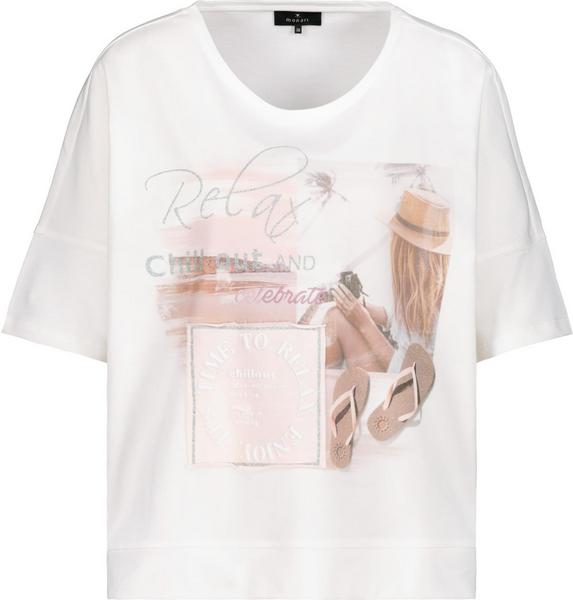 Das Rundhals-Shirt von monari hat einen Halbarm mit breiten Bündchen an Ärmelenden und am Saum, überschnittene Schultern und kommt mit einem weiten Regular Fit, sodass es am Oberkörper locker fällt. Das Damenmodell setzt sich durch einen großen Fotodruck mit Frau am Strand und Flip-Flops, Glitterschrift und einem Stoffpatch mit Schnittkanten sowie einem 3-D-Wording mit Glitterumrandung stilvoll in Szene. Der Mix aus Baumwolle und Modal verspricht zudem einen hervorragenden Tragekomfort. Zur Color-Jeans mit verkürztem Bein und unifarbenen Sneaker ein echter Blickfang.