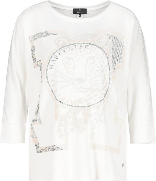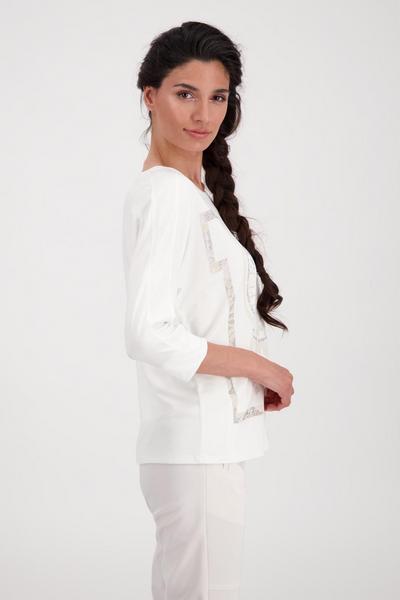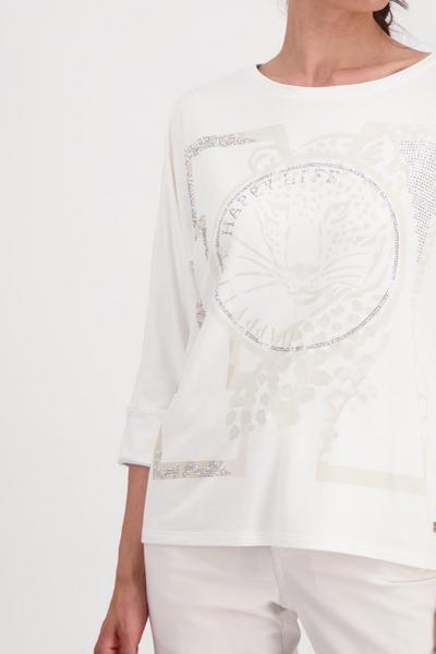 Das Jersey Shirt präsentiert sich mit einem Panther-Print geschmückt mit Glitzer und Strass Emblem. Durch den Elasthan Anteil und der fließenden Viskosemischung schmiegt sich das 3/4 Arm Shirt wunderbar an den Körper an