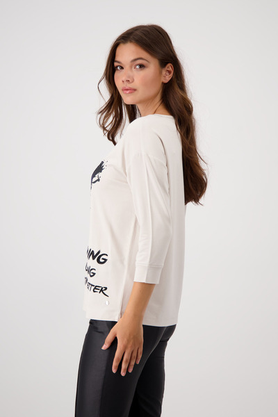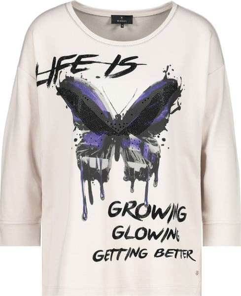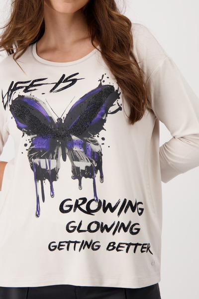 Das 3/4 Arm Shirt aus fließender Viskose Mischung überzeugt mit weicher Haptik. Ein großer Schmetterling Print mit Schrift sorgt für einen harmonischen Charakter.