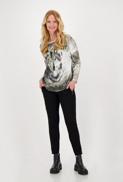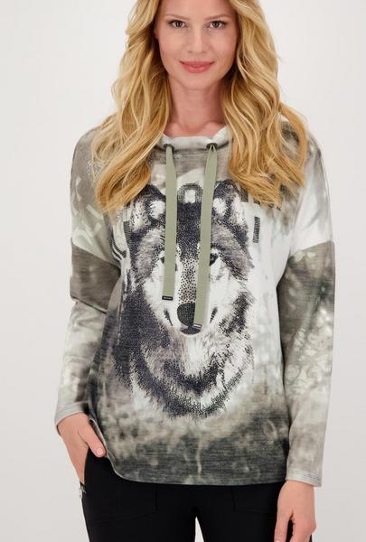 Supersoft und angenehm auf der Haut für ein tolles Tragegefühl - das Langarm Jersey Shirt aus fließendem Viskose-Mix mit Stretchanteil von monari. Regular Fit mit überschnittenen Schultern und einem Stehkragen mit Tunnelzug, Ringösen und Bindeband. Ein großer, platzierter Wolfskopf mit Strassverzierung und funkelnde Strassschrift schmücken die Front stilvoll. Probieren Sie es aus.