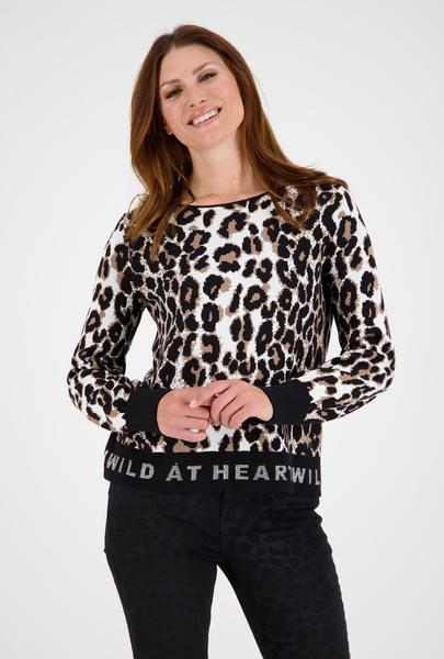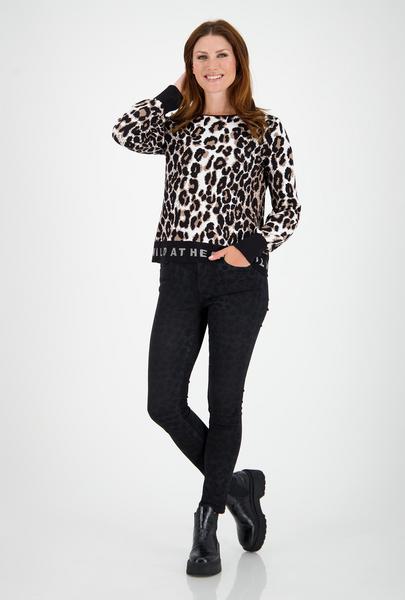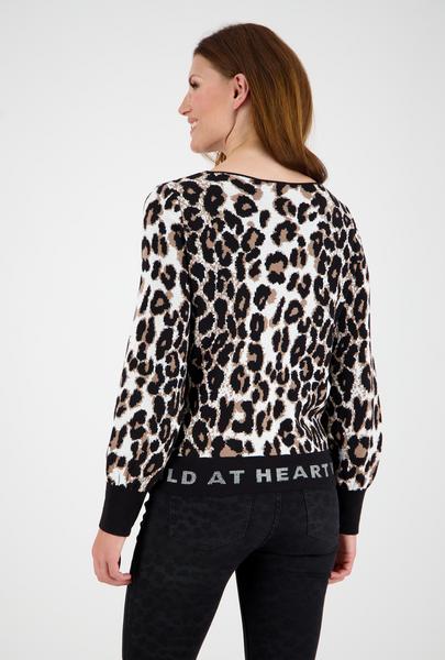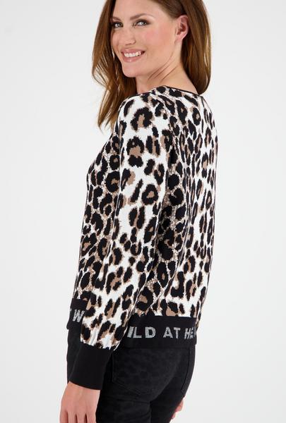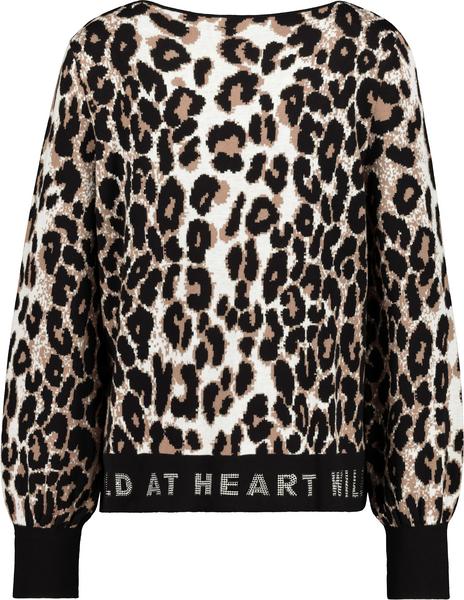 Wild at heart - mit diesem Strickpullover von monari. Das animalistische Modell begeistert mit einem Leo-Jacquard. Der unifarbene Saum wird mit einem funkelnden Strassschriftzug glamourös geschmückt. Freuen Sie sich auf 100% Baumwolle und Ihr neues Langarm-Piece!