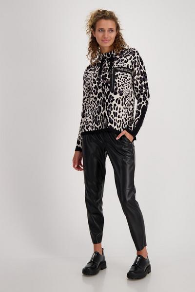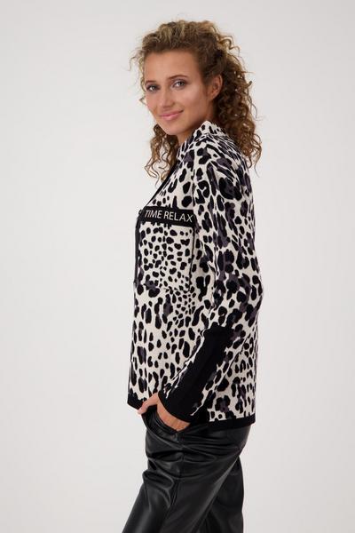 Wild at Heart – so lautet das Motto des extravaganten Pullovers von monari. Der schöne Leo-Jacquard wird durch unifarbene Bündchen an Ärmelenden und am Saum und unifarbene Stoffeinsätze mit einem 3-D-Wording am linken Ärmel stilvoll unterbrochen. Die Vorderseite wird von einer aufgesetzten Tasche mit Reißverschluss und einem 3-D-Wording auf Brusthöhe geschmückt. Kleine Feinheiten wie der Stehkragen und die gerade, lockere Form mit Seitenschlitzen und verlängerter Rückseite machen das hochwertige Baumwoll-Modell zu einem idealen Partner von schwarzen Lederoptik-Hosen.