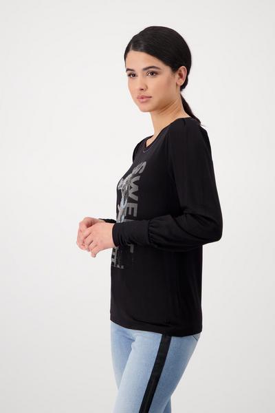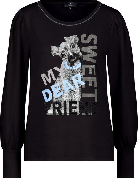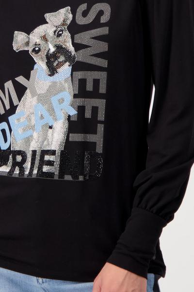Das Shirt aus fließender Viskosemischung ziert ein geschmückter Hund mit Strass Schrift. Schultern sind mit gelegten Falten versehen.